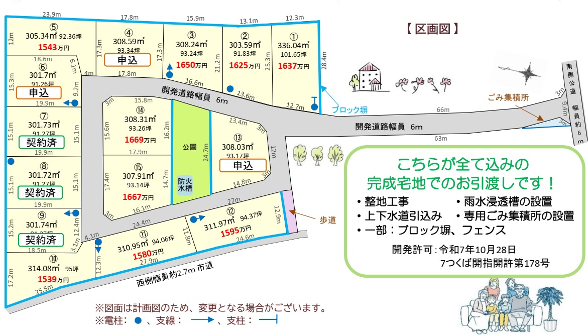 | 備考 | ※本物件は特定建築条件付売買予定地11区画、専用住宅4区画の計15区画分譲地です。 特定建築条件付売買予定地を購入された方は、土地売買契約後3ヶ月以内に建物請負契約の締結が条件となります。詳細はお問合せ下さい。 【自社開発・完成宅地渡し】 つくば市上横場に全15区画、ゆとりある敷地×整備済み宅地分譲地が誕生します! ■【敷地面積300㎡超 × 建ぺい率60%】 贅沢な平屋も、開放感ある二階建ても可能。 余裕ある庭や駐車スペースが確保でき、ゆったりとした暮らしが叶います。 ■【在宅ワークも快適に】 ・静かな住環境でテレワークにも最適 ■【安心・快適な暮らしを支える設備】 ◎上下水道完備 ◎雨水貯留槽設置 ◎専用ごみ集積所あり ◎一部ブロック塀+メッシュフェンス施工 ◎防火水槽設置 ◎公園 遊具ベンチ設置 |